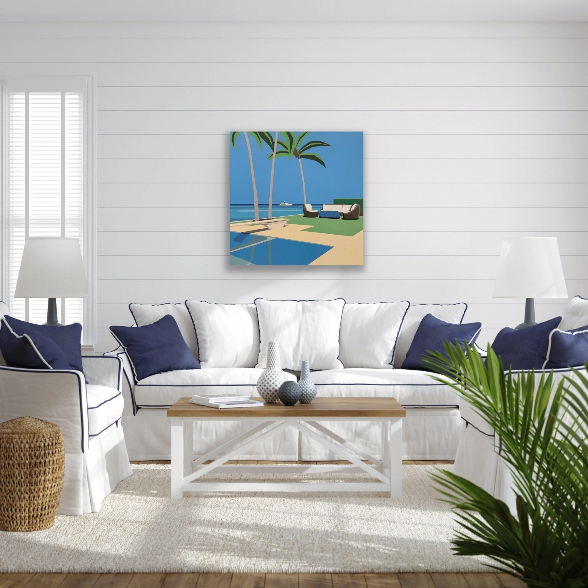 Patio Dreams invites the viewer onto a sun-drenched patio where the scene becomes a canvas for personal imagination. The composition is serene and open—palm trees swaying lightly, modern patio furniture arranged in quiet anticipation, and a glimmering pool reflecting the clear blue sky. Yet the painting is intentionally ambiguous, offering multiple ways to inhabit the space.